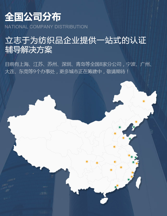 纺织品认证中心成立于2006年,业务范围涉及纤维、纱线、面料、服装、家居用品、产业用纺织品等纺织材料及其制品的各个领域。目前已在上海、江苏、浙江、山东、广东等地设立分支机构,在宁波、沈阳、广州等地设有办事处和工作站,辐射全国34省份/地区,可就近为客户提供本地化上门服务,致力于为纺织行业的发展提供强有力的技术支持。