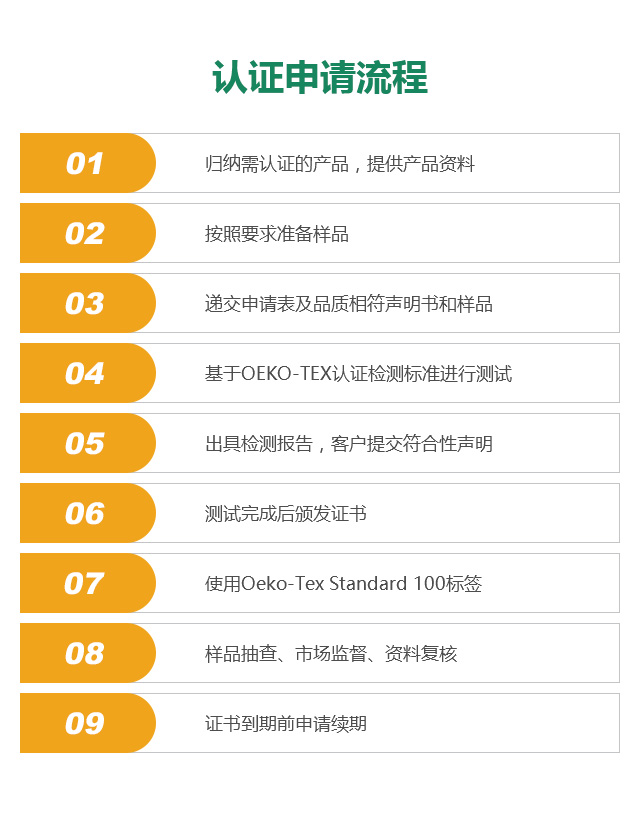 所有与纺织品的生产和销售有关的生产商、经销商都可以就产品来申请Oeko-Tex Standard 100认证。包括纤维、纱线、坯布、辅料、服装以及从事染整加工和其它与纺织品有关的生产商、经销商。认证申请需要向国际环保纺织协会的成员机构提出。