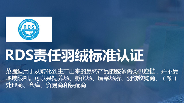 RDS适用于工业化和小型农场/散户收集渠道。该标准包含一个可选模块,用于孵化农场认证。该标准适用于混纺和100%认证的产品;但是如果最终产品中的羽绒或羽毛已通过100%认证,则最终产品只能标记为RDS认证。