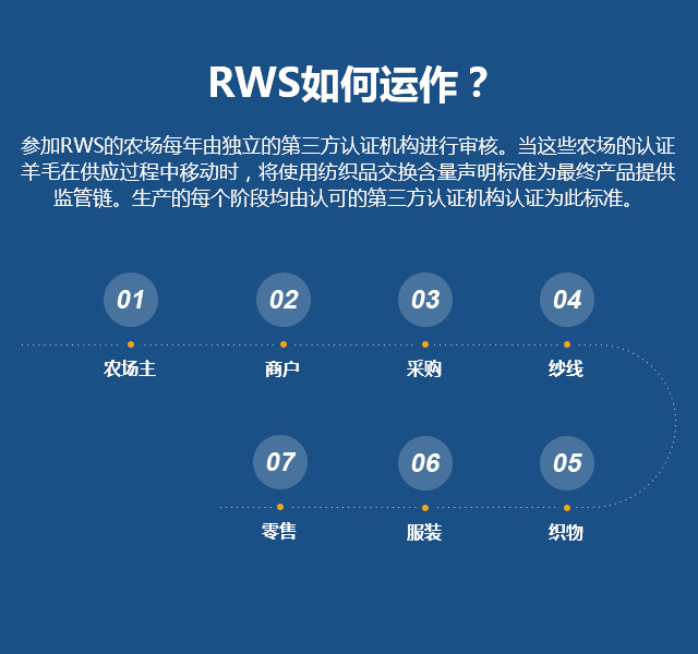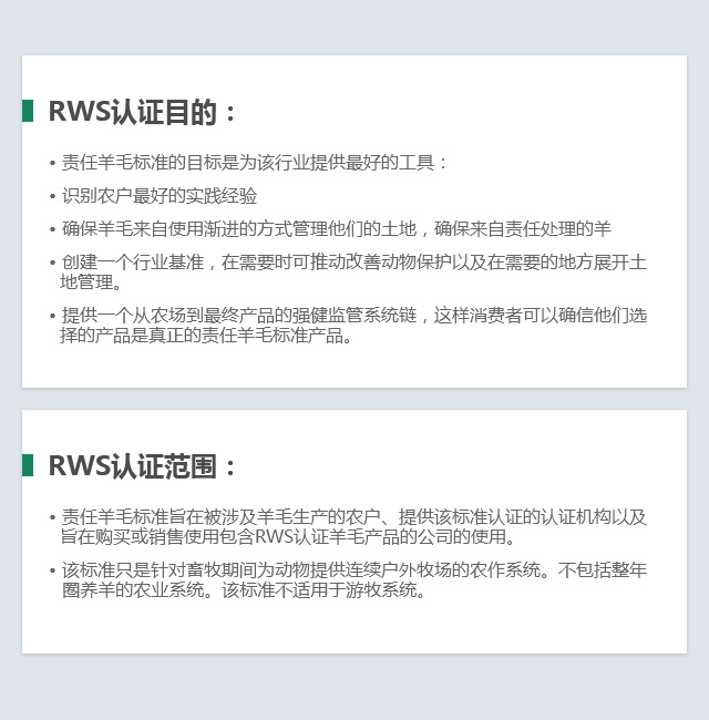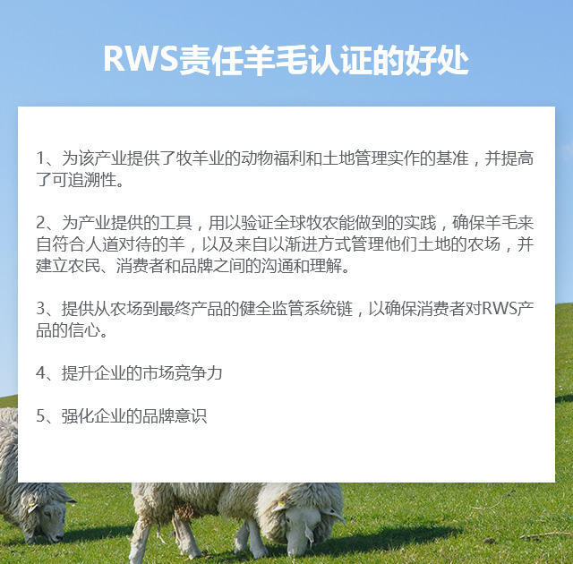 负责任的羊毛标准(RWS)是一项自愿性全球标准,对羊的福利和土地管理实务做了明确规定,不仅让您的品牌获得了关键的差异化优势,还有助于您对羊毛供应链进行完整的追溯。RSW要求处理羊毛的各个环节(从农场到较后制造商)都接受相应标准模块的认证,但零售商除外。产品或者是纯羊毛产品,且羊毛通过了相关认证,或者是羊毛混纺品,经过认证的羊毛的占比达到5%-99%,只有前者才能贴上RWS标志。羊毛认证让您获益匪浅,可以证明或突出强调您恪守承诺,致力于在动物福利和土地管理方面恪守较佳实践方法。