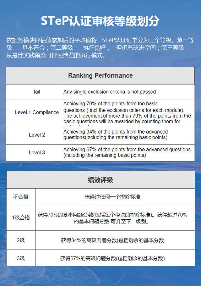 STeP全面分析您生产设施的每个相关领域,以便对企业的可持续生产条件进行一个全面、透明的评估。该认证的在线调查包含六大模块:1)化学品管理 2)环境绩效 3)环境管理 4)健康与安全 5)社会责任 6)质量管理
